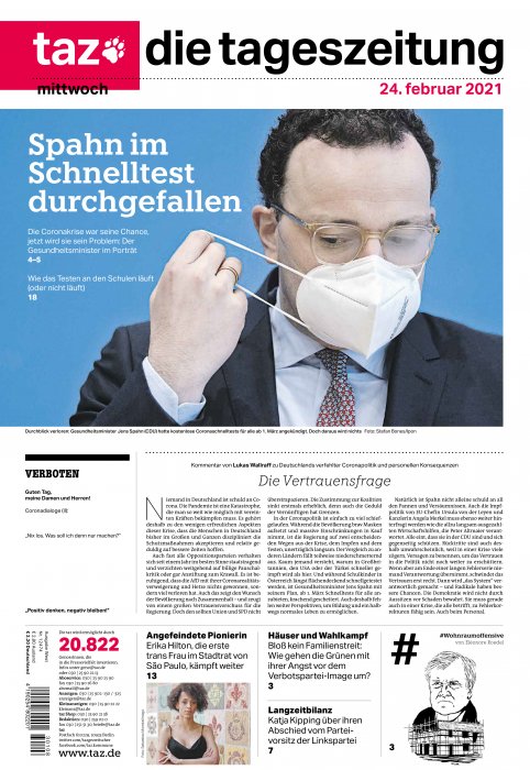 Corona-Pandemie   "Jens Spahn galt als Gewinner der Coronakrise, mittlerweile steht er mit dem Rücken zur Wand."      Spiegel 09/202 & taz 24/02/21