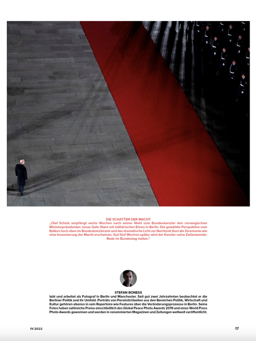 Ein Scholz-Foto in der Rubrik Zeitenblende - Die Lieblingsfotos des Jahres 2022 renommierter Politikfotografen in Politik&Kommunikation Dezember 2022
