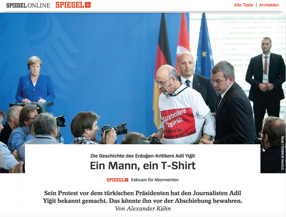 Der Kollege Adil Yiğit protestiert mit seinem t-shirt während der Erdogan/Merkel PK.