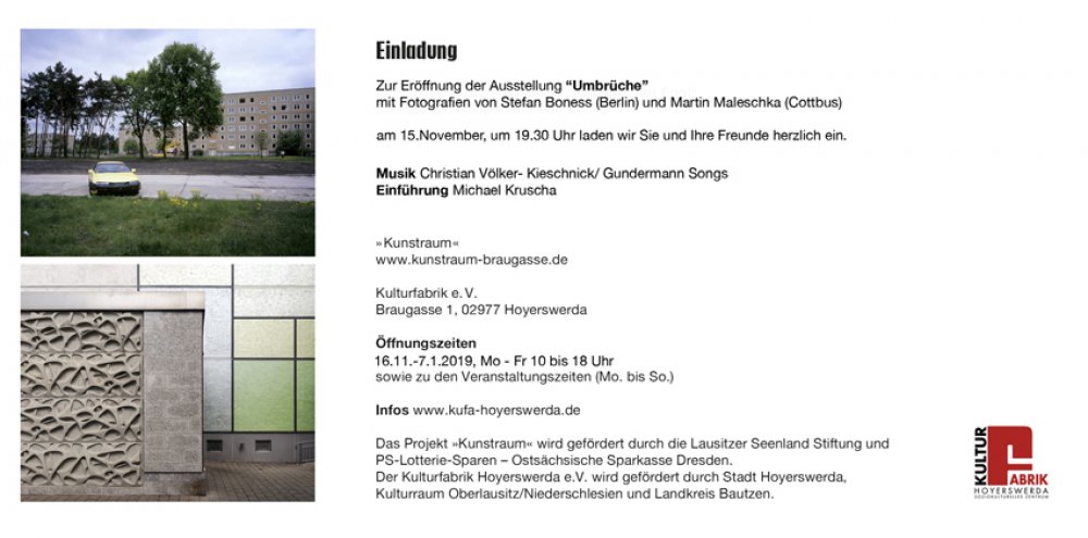 Am 15. November eröffnet die Ausstellung Umbrüche der Fotografen Stefan Boness und Martin Maleschka mit unterschiedlich visuellen Sichten und Perspektiven auf die Stadt Hoyerswerda. Thematisiert und exemplarisch zugespitzt werden dabei die städtebaulichen Herausforderungen, denen sich nicht nur ostdeutsche Städte als Folge der Abwanderung stellen müssen.
