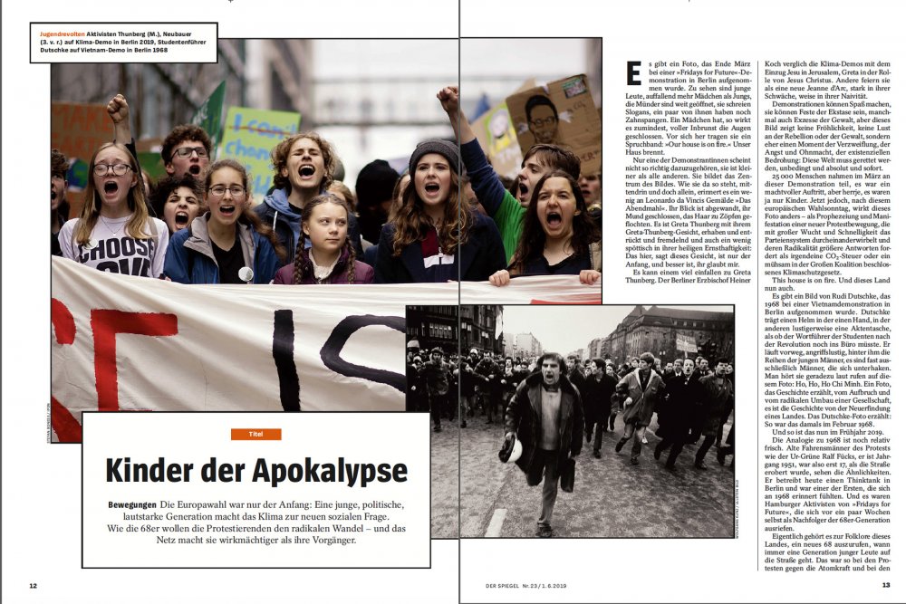 Jetzt jedoch, nach diesem europäischen Wahlsonntag, wirkt dieses Foto anders – als Prophezeiung und Manifestation einer neuer Protestbewegung, die mit großer Wucht und Schnelligkeit das Parteiensystem durcheinanderwirbelt und deren Radikalität größere Antworten fordert als irgendeine COÇ-Steuer oder ein mühsam in der Großen Koalition beschlossenes Klimaschutzgesetz." (Spiegel)