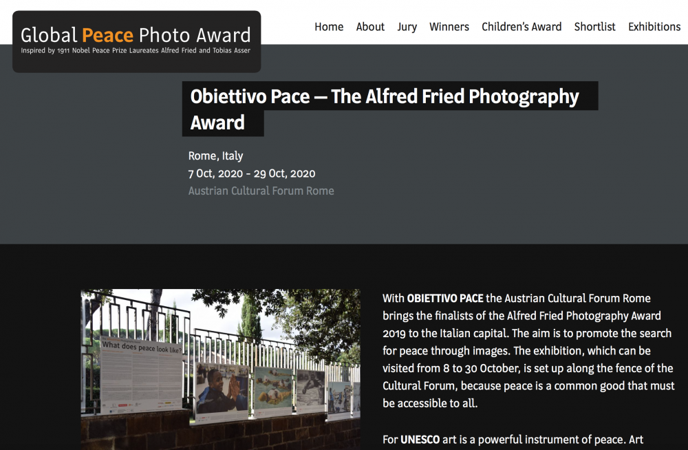 With OBIETTIVO PACE the Austrian Cultural Forum Rome brings the finalists of the Alfred Fried Photography Award 2019 to the Italian capital. The aim is to promote the search for peace through images. The exhibition, which can be visited from 8 to 30 October, is set up along the fence of the Cultural Forum, because peace is a common good that must be accessible to all.